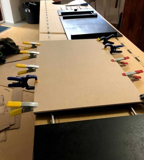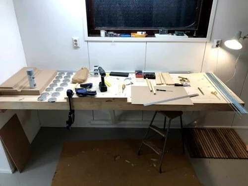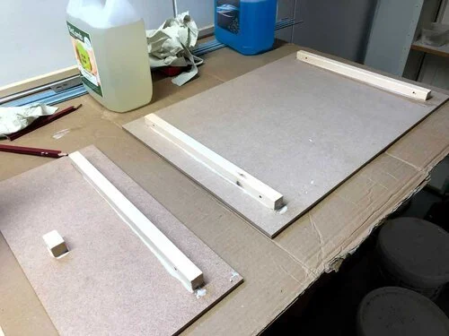 Nu var skivorna färdigt sågade och träribbor införskaffade och också de sågade till rätta längder. Så det var dags att fästa träribborna i skivan.