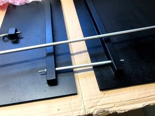 Framme på utställningsplatsen var det dags att börja montera alla gängstänger och rör fast i tavlorna. Gängstängerna kunde fortsätta ner längs med tavlan så de behövdes inte sågas av. Men aluminium rören måste jag såga rätt längder eftersom bilderna är i höjd med golvet då blir varje tavlas rör olika långa. För att vara säker på att det blir rätt och snyggt så satte jag upp varje tavla först utan rör, mätte längden och tog ner tavlan för att träda på röret, sedan upp igen.