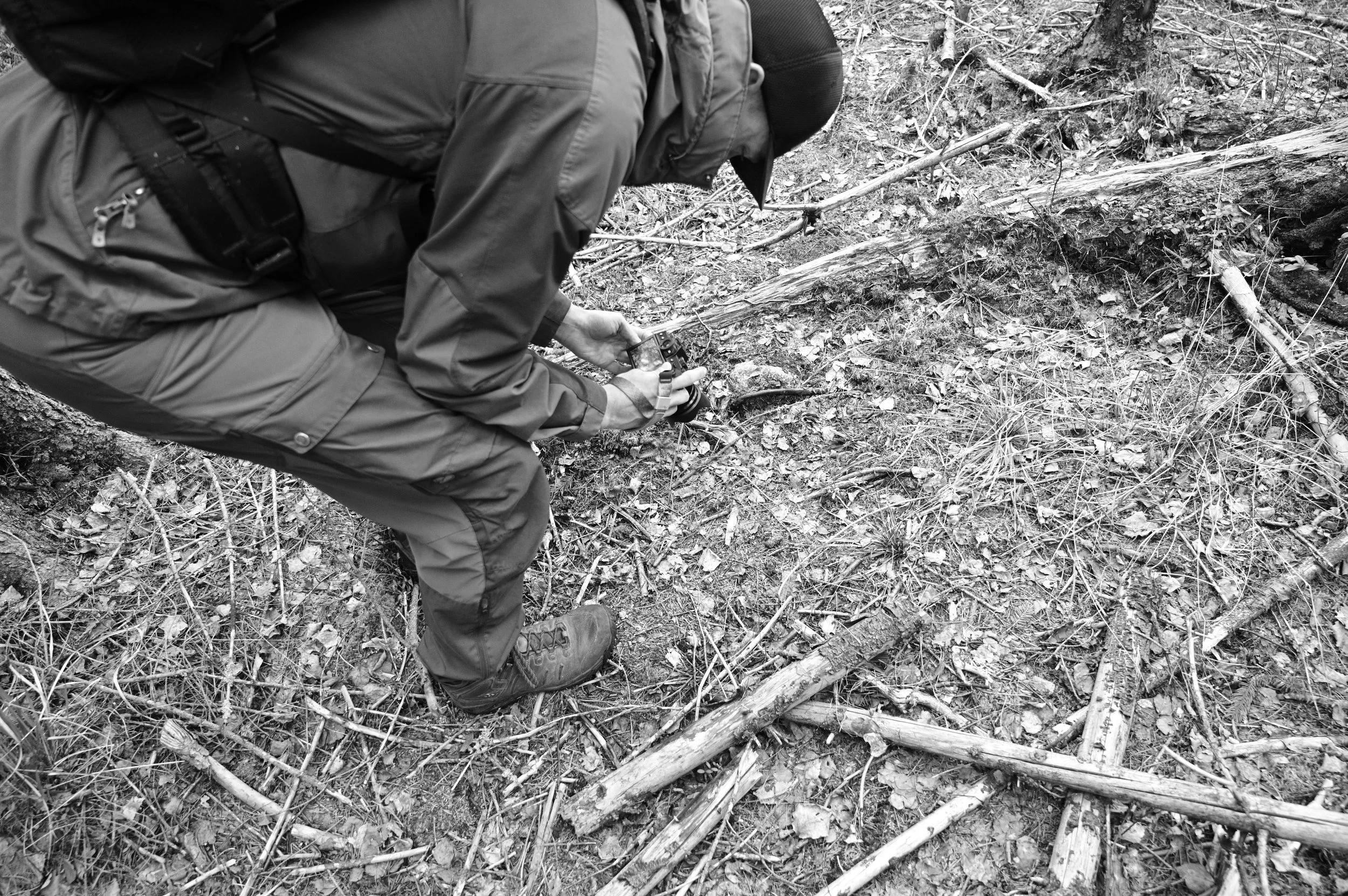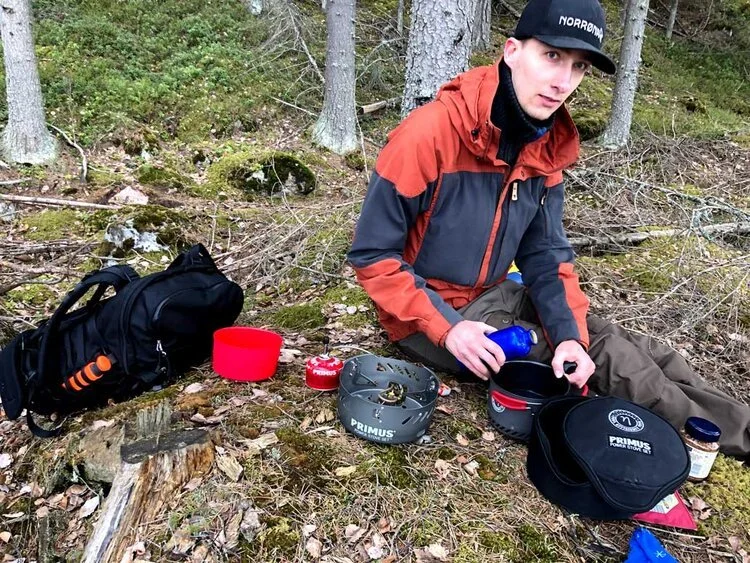 Klockan blev 16.00 och vi blev hungriga. Vi hade gått förbi den "allmänna" utsatta eldstaden och flera andra fina ställen och hade hoppats att vi skulle hitta ett ännu finare ställe att tillreda maten vid högre upp, men det visade sig att det inte fanns. Så vi fick nöja oss med en helt okej plats just efter det utmärkta naturskyddsområdet hade slutat.