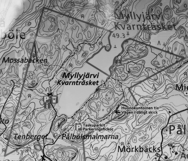 Själva rutten så går ett stycke längs träsket, men också en runda inne i skogen. Vid träsket finns utsatt eldstad. Men jag såg att folk hade nog byggt sin egen eldstad på flera andra ställen. Vi valde att gå runt träsket moturs.